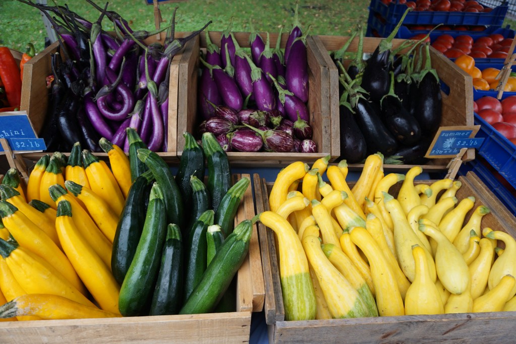 A typical August pick-up will look like: 4 tomatoes, 3 zucchini, 1 head of lettuce, 1 bunch of swiss chard, 2 salad cucumbers, 1 pound of carrots, 4 eggplants, 1 bunch of scallions, 1 pint pick-your-own cherry tomatoes, 1 pint pick-your-own lunchbox sweet peppers OR jalapeno peppers, pick-your-own flower bouquet.